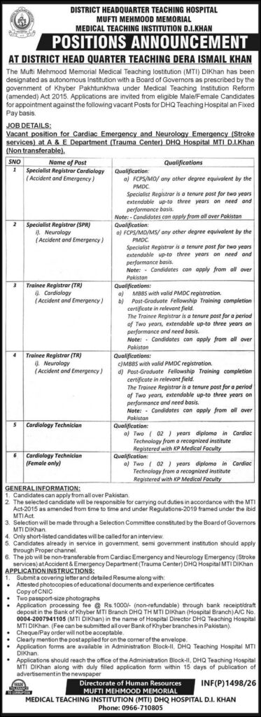 The Mufti Mehmood Memorial Medical Teaching Institution (MTI) D.I. Khan has officially announced several vacant positions for its Accident & Emergency Department (Trauma Center). These roles are specifically designed to bolster the Cardiac and Neurology Emergency (Stroke services) at the District Headquarter Teaching Hospital.