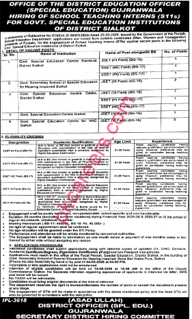 The Office of the District Education Officer (Special Education) Gujranwala has officially announced the recruitment of School Teaching Interns (STIs) for various government special education institutions across District Sialkot. This initiative, under the Government of the Punjab Special Education Department, seeks dedicated men, women, and transgender individuals to support students with special needs.