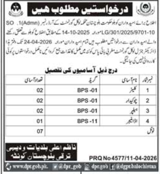 Submission Deadline: All applications, along with complete supporting documents, must reach the office of the Director General, Local Government, Western Bypass, Quetta, no later than April 24, 2026.