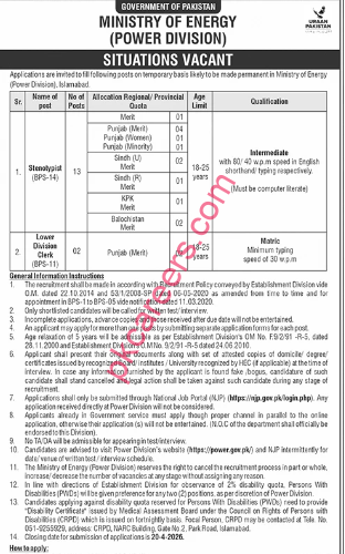 Ministry of Energy (Power Division) Announces New Job Vacancies