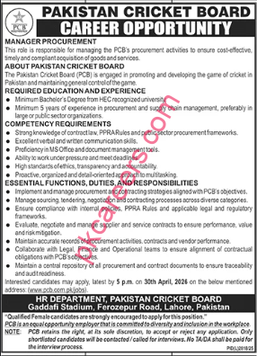 The Pakistan Cricket Board (PCB) is officially seeking a highly qualified professional to fill the role of Manager Procurement. This critical position is tasked with overseeing the board’s procurement activities, ensuring that the acquisition of goods and services is cost-effective, timely, and strictly compliant with regulatory frameworks.