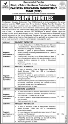 The Ministry of Federal Education and Professional Training has announced several high-level career opportunities within the Pakistan Education Endowment Fund (PEEF). These positions are part of the PSDP project titled “Prime Minister’s Pakistan Fund for Education” and are offered on a contract basis for the duration of the project.